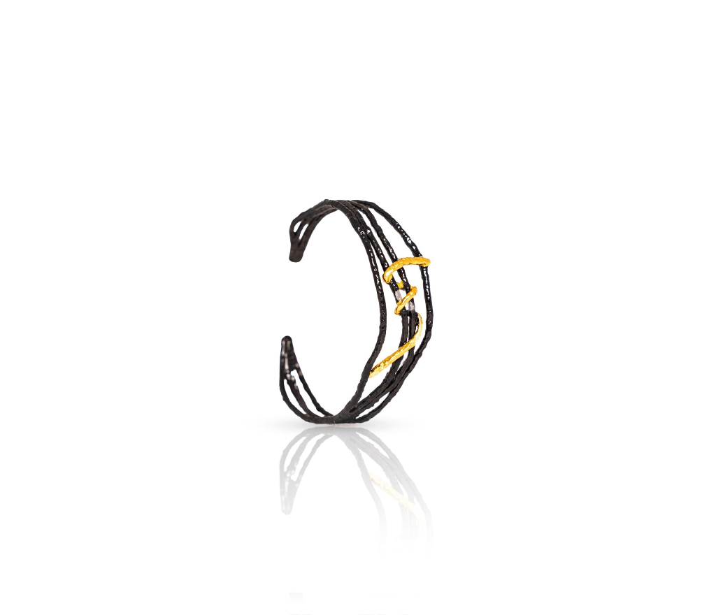 Discover our Serpenta Cuff. This striking bracelet features an intricate design of multiple black bands, elegantly twisted together to form a unique and modern cuff. Accentuated by sleek, gold-tone embellishments that wrap around the bands. The contrast between the black and gold creates a bold yet sophisticated look.